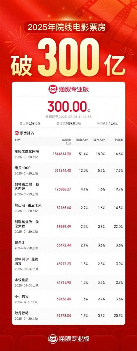 1905电影网专稿 据票务平台数据,2025年7月8日11时43分,2025年度票房(含预售)破300亿,快于2024年28天到达,年度票房榜前十电影中国产电影占9部,《哪吒之魔童闹海》《唐探1900》《封神第二部:战火西岐》分列年度票房榜前三位,其中《哪吒之魔童闹海》年度票房占比超51%持续领跑!